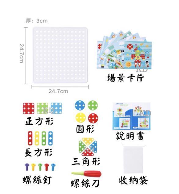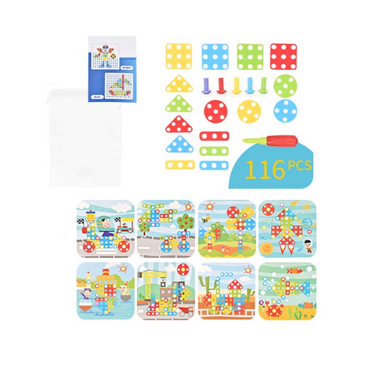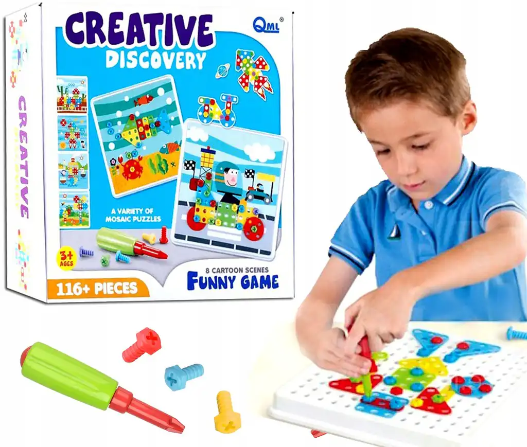 🎨 مكونة من 8 لوحات مرسومة برسومات ممتعة وكل لوحة فيها ثقوب تساعد الطفل يركّب عليها الأشكال الهندسية باستخدام المسامير البلاستيك والمفك الصغير.