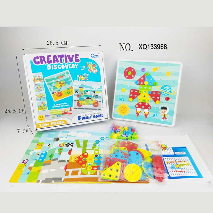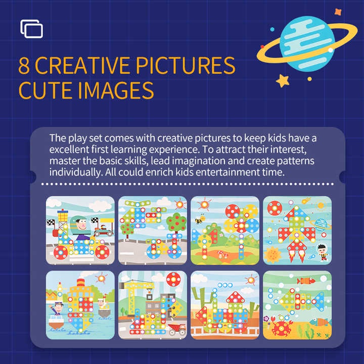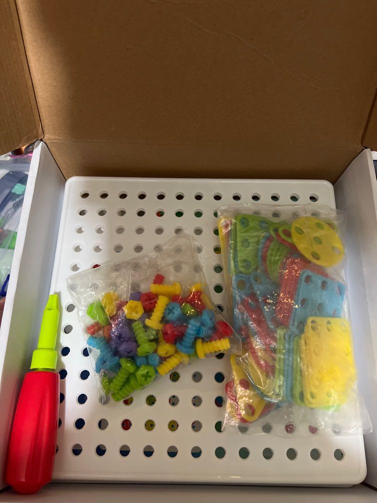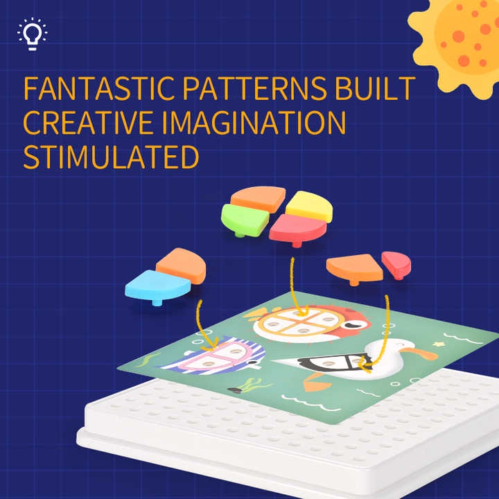 💡 الطفل بيحط الكارت على البورد المخرم، ويبدأ يركب القطع حسب الرسمة أو يبتكر أشكال من خياله زي 🚗 وسائل المواصلات، 🐟 الأسماك، 🌳 الأشجار، وأي فكرة تيجي في باله!
