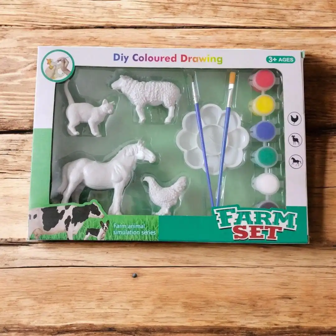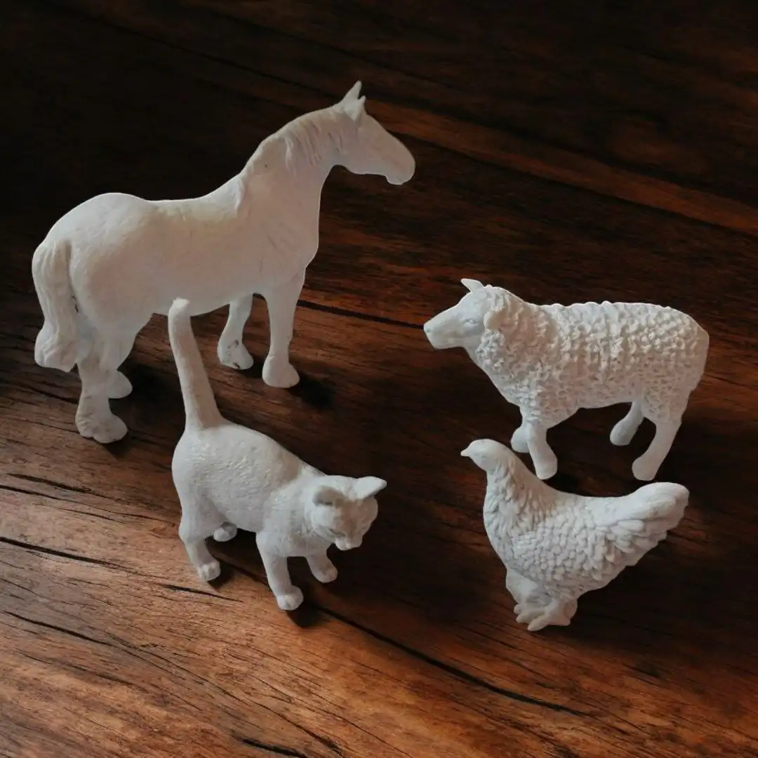 4 حيوانات مزرعة بلاستيكية متينة باللون الأبيض ليعيدوا تلوينها بطريقتهم.
