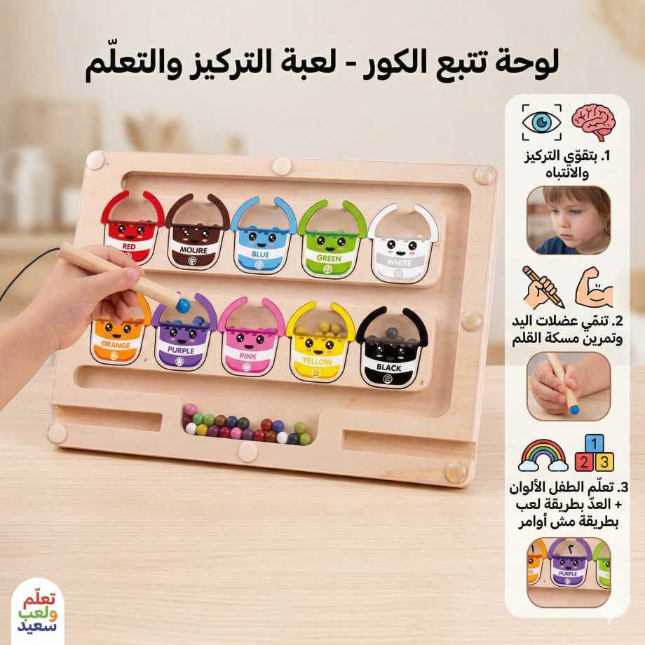 لوحة تتبع الكور لتعليم الألوان والعدّ للأطفال. تنمّي التركيز، وتقوّي عضلات اليد، وآمنة بالكور المقفولة داخل اللوحة. مثالية من 3 سنوات فأكثر.