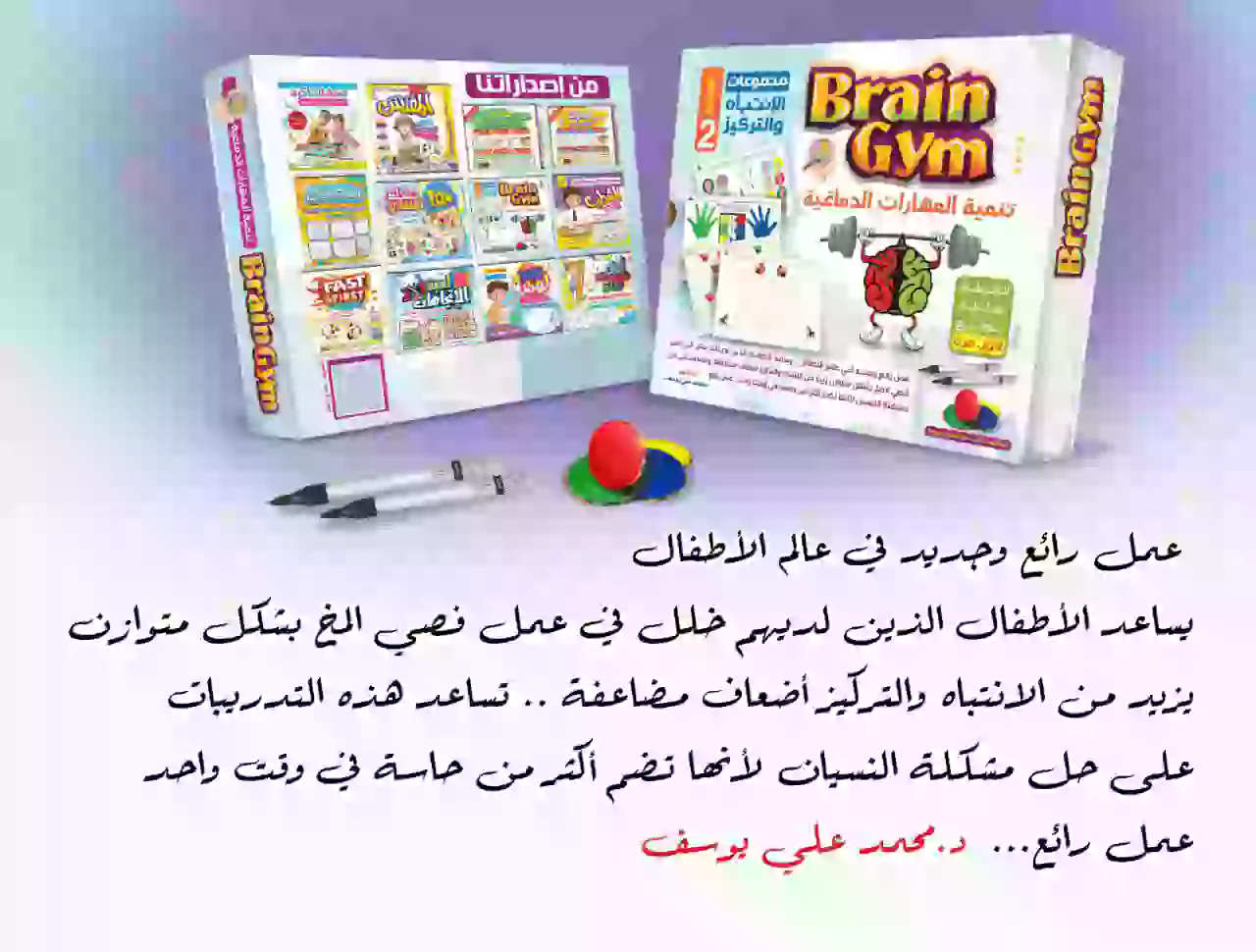 “عمل رائع وجديد في عالم الأطفال يساعد الأطفال الذين لديهم خلل في عمل فصي المخ بشكل متوازن، يزيد من الانتباه والتركيز أضعاف مضاعفة، ويساعد على حل مشكلة النسيان لأنها تضم أكثر من حاسة في وقت واحد.”